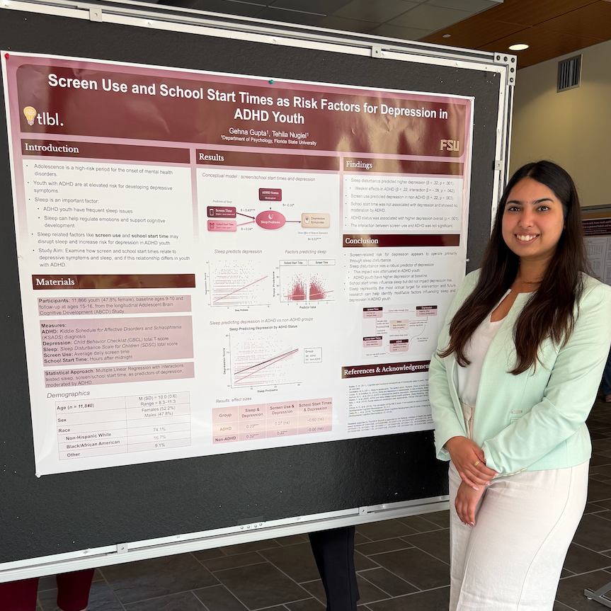 Gehna Gupta is a first year PhD student presenting her poster titled “Screen Use and School Start Times as Risk Factors for Depression in ADHD Youth.”